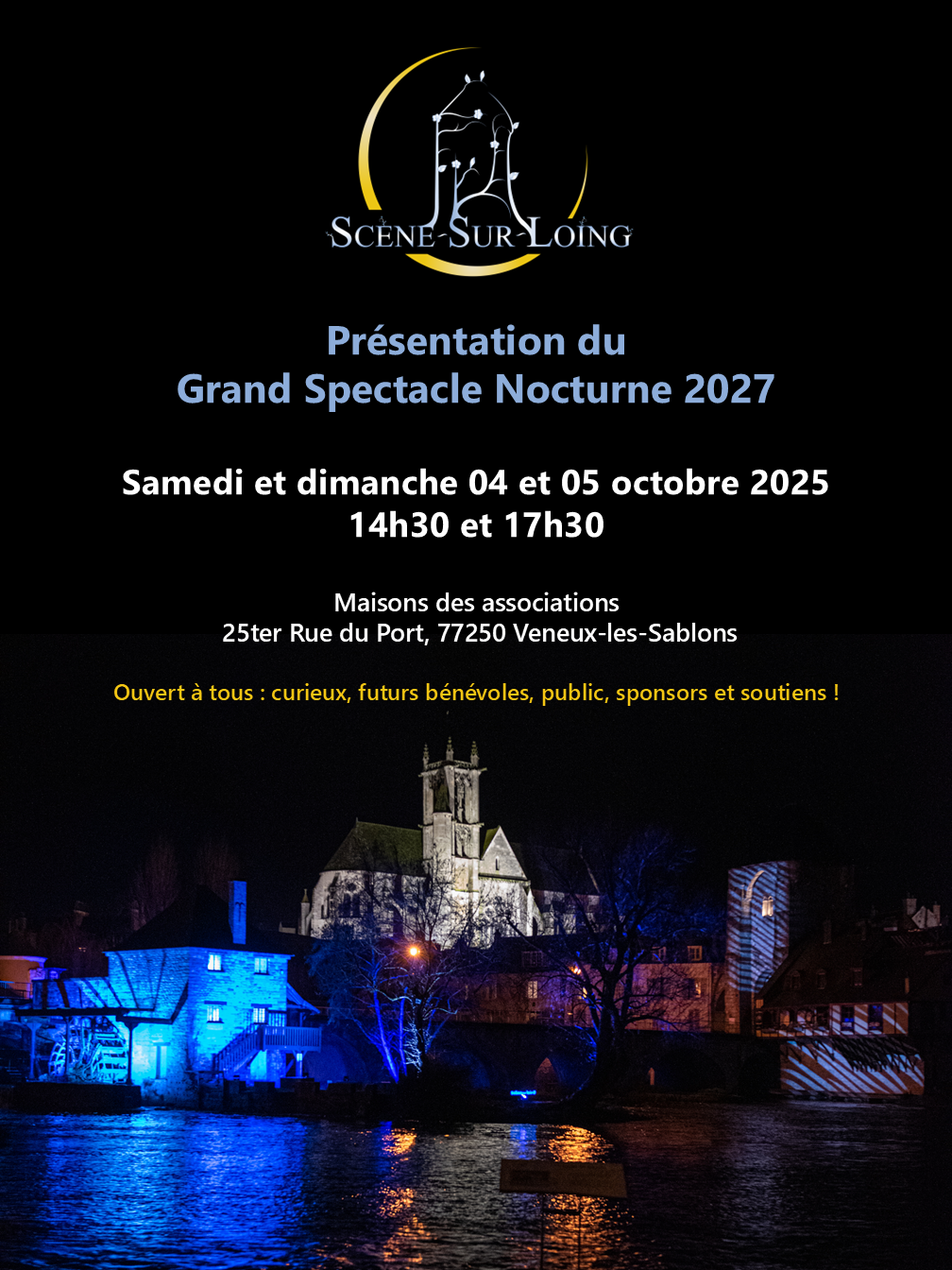 En 2027 l'association Scène Sur Loing présentera sont premier grand spectacle nocturne au bord du Loing à Moret Sur Loing.